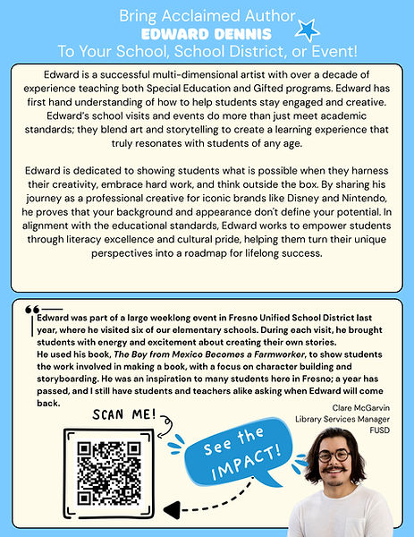 He used his book, The Boy from Mexico Becomes a Farmworker, to show students the work involved in making a book, with a focus on character building and storyboarding. He was an inspiration to many students here in Fresno; a year has passed, and I still have students and teachers alike asking when Edward will come back.